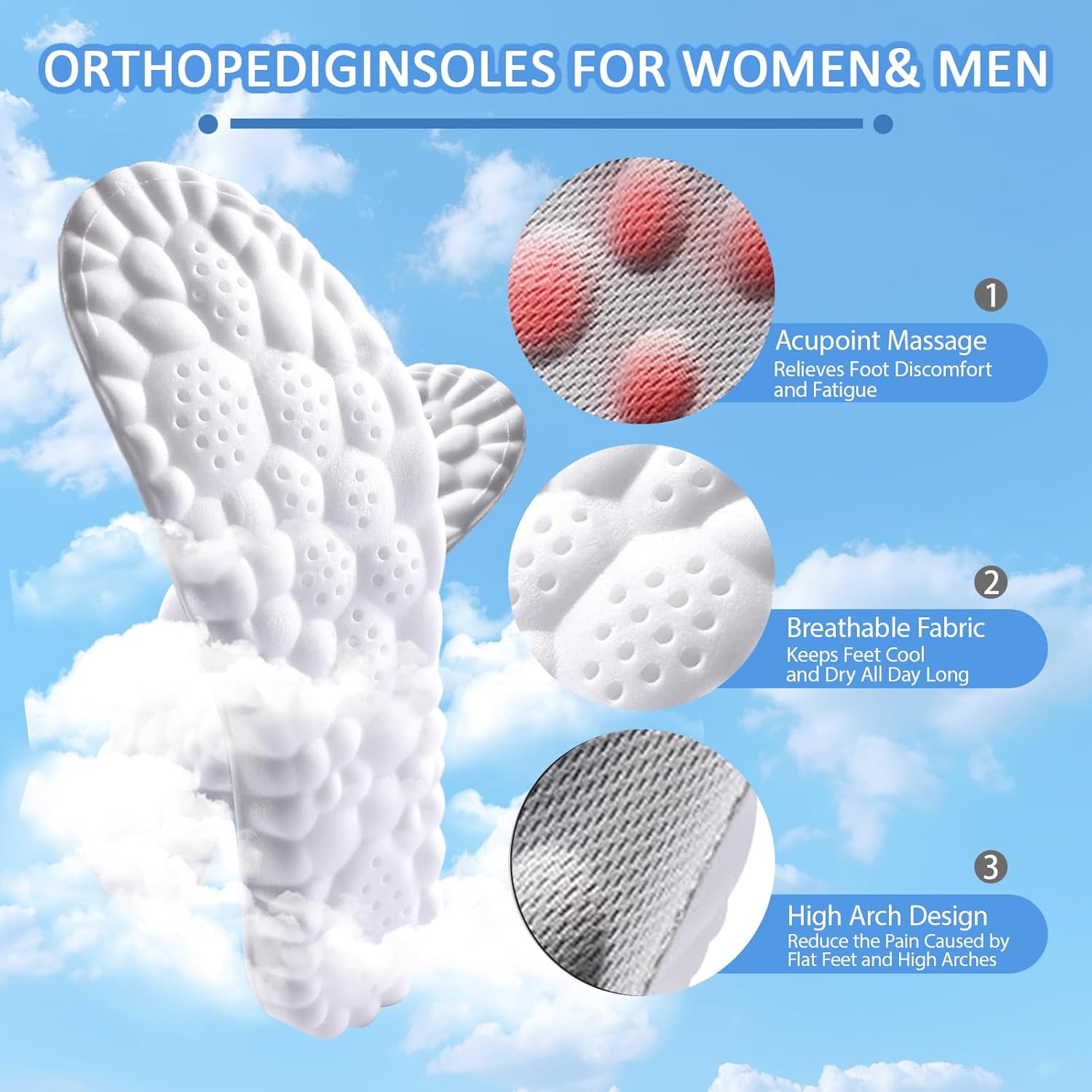 2 Pairs Massage Insoles for Men Women – 4D Cloud Orthopedic Insoles, Memory Foam Cushion Insole, Shock Absorption & Arch Support
